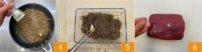 Ajuste o sal e a pimenta 4 e cozinhe em fogo alto até secar. Transfira-os para uma tigela 5 e deixe esfriar completamente. Pegue o filé e tempere com sal 6.