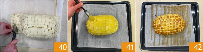 Corte o excesso de massa folhada 40. Transfira o filé para uma assadeira coberta com papel manteiga e pincele a massa com a gema de ovo 41. Asse em forno ventilado pré-aquecido a 180° por 35-40 minutos, dependendo do grau de cozimento desejado 42.