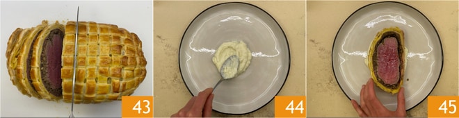 Uma vez retirado do forno, deixe o filé descansar por alguns minutos antes de cortá-lo em fatias 43. Sirva distribuindo o purê de batatas no fundo do prato 44, depois coloque a fatia de filé por cima 45.