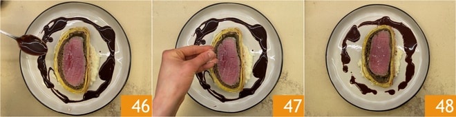 Complete com o molho de vinho tinto 46 e uma pitada de sal de maldon 47. Seu filé à Wellington está pronto para ser servido 48!