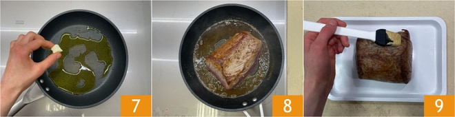 Em uma frigideira, acrescente um fio de óleo e a manteiga 7, depois deixe derreter. Doure todos os lados do filé até ficar dourado 8. Deixe esfriar e pincele todos os lados com mostarda 9.