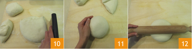 Após o tempo de fermentação, divida a massa em 4 porções de 450 gramas cada 10 e forme bolas 11 que você irá estender com o rolo 12.