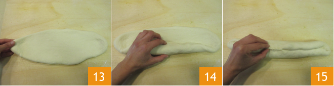 Você deve obter uma forma elíptica com cerca de 30 cm de comprimento 13. Agora, enrole a massa pelo lado mais comprido, pressionando com os dedos a cada volta para que o rolo mantenha a forma 14, depois aperte a junção para selar 15.