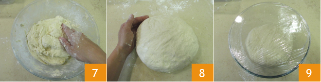 Continue amassando até obter uma mistura homogênea 7, depois transfira para a superfície de trabalho e trabalhe rapidamente para formar uma bola 8. Coloque novamente a massa obtida na tigela, cubra com filme plástico e deixe crescer por pelo menos 3 horas no forno desligado com a luz acesa.