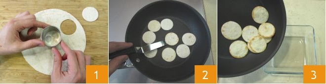 Para preparar os finger food de pepinos e homus, primeiro corte 16 discos das tortillas usando um cortador com diâmetro de 5 cm 1. Aqueça bem uma grelha e grelhe os discos por 2 minutos de um lado e 1 minuto do outro 2, depois reserve-os 3.