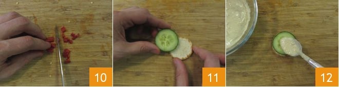 Por fim, pique finamente a pimenta fresca, depois de remover as sementes 10. Você está pronto para montar os finger food: coloque uma fatia de pepino sobre cada disco de tortilla 11, depois adicione uma colher de chá de homus 12.