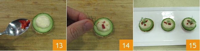 Por último, decore com a pimenta fresca 13 e uma folhinha de funcho selvagem 14. Seus finger food de pepinos e homus estão prontos para serem saboreados 15!