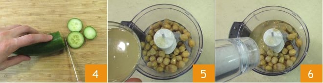 Corte o pepino em fatias de 1 cm de espessura, sem remover a casca 4. Agora, passe para a preparação do homus: coloque o grão-de-bico em um processador de alimentos junto com o tahine 5, depois adicione o sal 6,