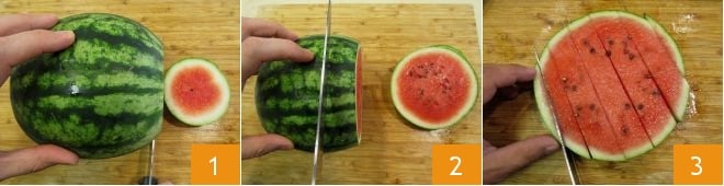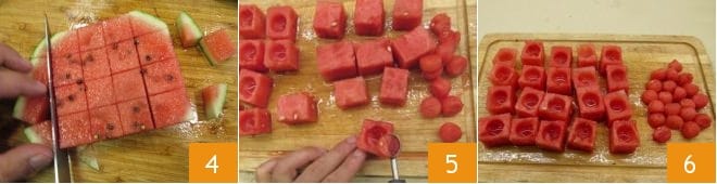Para preparar os finger food melancia e queijo de cabra, comece pela melancia baby bem fria: serão necessários cerca de 200 g ao todo, então corte a tampa 1, faça fatias de cerca de 3 cm de espessura 2 e faça cortes a uma distância de cerca de 3 cm um do outro 3;