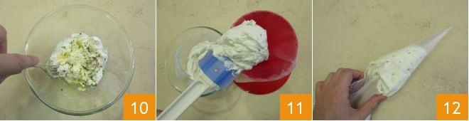 e misture tudo para incorporar 10. Uma vez obtido um creme homogêneo, coloque-o em um saco de confeitar descartável 11, com bico estrela de 6 mm.