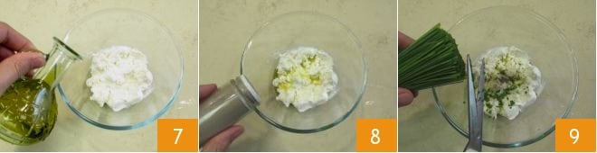 Em uma tigela, coloque o queijo de cabra e o azeite extra virgem 7, sal e pimenta 8; adicione a cebolinha picada, pegando a parte mais verde e cheirosa 9