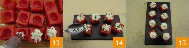 Recheie cada cubinho com um pequeno montinho de creme de queijo de cabra 13, polvilhe a gosto com mais cebolinha picada 14 e sirva seus finger food melancia e queijo de cabra 15!