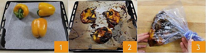 Para preparar a falsa carbonara, comece pegando os pimentões amarelos e, depois de lavá-los cuidadosamente, coloque-os em uma assadeira com papel manteiga 1. Asse os pimentões a 250 graus em forno estático por 40-45 minutos (em forno ventilado a 230 graus por cerca de 35 minutos) 2. Assim que estiverem cozidos, coloque os pimentões em um saco e deixe-os esfriar por cerca de dez minutos, esse procedimento facilitará a retirada da pele e permitirá que você os descasque com mais facilidade 3.