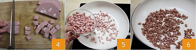 Enquanto os pimentões esfriam, pegue a mortadela e corte em cubos 4. Feito isso, coloque os cubos de mortadela para dourar em uma frigideira antiaderente grande, sem adicionar óleo, 5 até que fiquem dourados 6