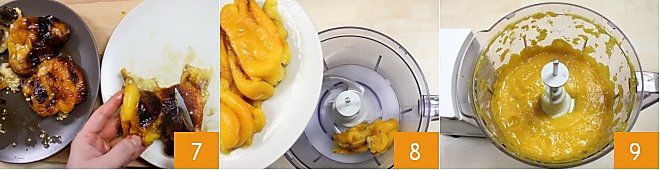 Pegue os pimentões e limpe-os: retire o caule, a pele e as sementes com a ajuda de uma faca 7. Uma vez limpos, coloque os pimentões no liquidificador 8 e bata até obter um creme homogêneo 9.