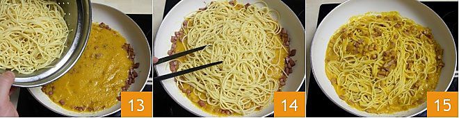 Quando o espaguete estiver al dente, escorra, cuidando para reservar 1-2 conchas de água do cozimento 13. Salteie o espaguete com o molho de pimentões e mortadela diretamente na frigideira, adicionando 1-2 conchas de água do cozimento e cozinhando em fogo baixo por alguns minutos para misturar tudo 14. Adicione um fio de azeite de oliva extravirgem e a sua falsa carbonara está pronta! 15