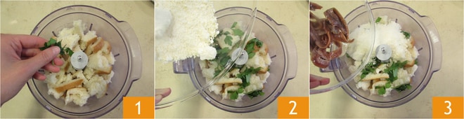 Para preparar as flores de abóbora ao forno com Grana Padano e anchovas, comece pelo recheio: coloque em um mixer o pão picado grosseiramente, a salsinha 1, o Grana Padano DOP2 e as anchovas escorridas 3.