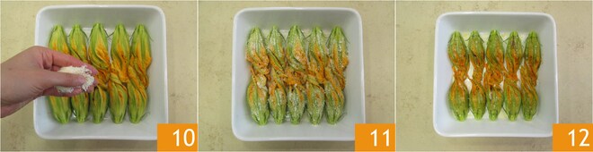 Polvilhe com Grana Padano DOP ralado 10 cobrindo todas 11 e asse no forno em modo grill pré-aquecido a 230 graus por 7 minutos. Sirva imediatamente as flores de abóbora ao forno com Grana Padano e anchovas 12.