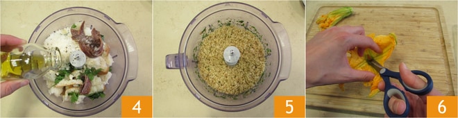 Tempere com óleo 4, pimenta e sal. Bata por alguns minutos, até que os ingredientes estejam bem misturados 5. Reserve o recheio. Agora, cuide da limpeza das flores de abóbora: retire o caule com delicadeza, lave suavemente em água corrente e seque com um pano, depois abra cuidadosamente uma a uma e, com a ajuda de uma tesoura, remova o pistilo interno 6