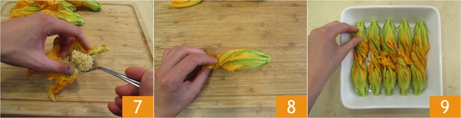 Com uma colher de chá, recheie-as, pressionando levemente para evitar romper a flor 7. Para cada flor de abóbora, serão necessários cerca de 3 colheres de chá de recheio. Feche-a torcendo delicadamente as pontas 8 e disponha-as alternadamente em uma assadeira 9.