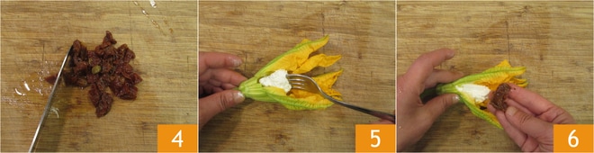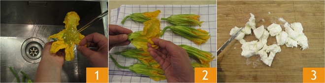 Para preparar as flores de abóbora recheadas com burrata e tomates secos, comece lavando-as delicadamente em água corrente 1. Seque sempre cuidadosamente com um pano. Quando estiverem secas, remova as saliências mantendo a base inferior, abra delicadamente a flor para identificar o pistilo interno. Então, retire o pistilo com as mãos de cada flor 2. Corte a burrata em fatias 3.