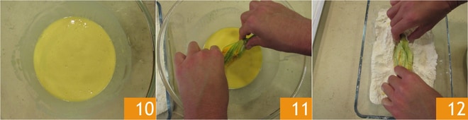 Você deve obter uma massa lisa 10. Em uma panela grande, aqueça o óleo até atingir 170-180°C, enquanto em uma tigela coloque o suficiente de farinha para enfarinhar as flores. Mergulhe-as uma a uma na massa 11, escorra o excesso de massa e passe na farinha 12.