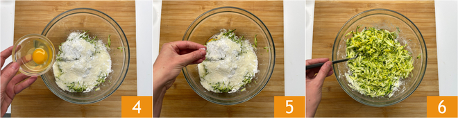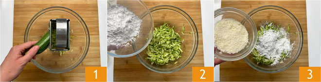 Para preparar a focaccia de abobrinha, lave e corte as pontas das abobrinhas, depois rale-as com um ralador de furos grandes 1 e coloque em uma tigela. Adicione o amido de milho 2 e o Parmesão 3.