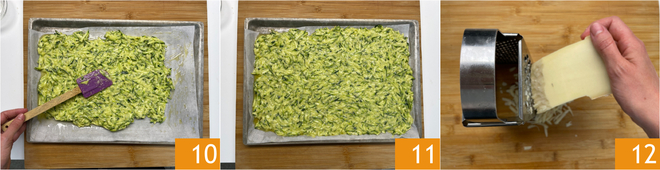 Distribua com uma espátula 10 de maneira uniforme 11, depois leve ao forno já aquecido a 180° por 15 minutos. Enquanto isso, rale o queijo fontina usando também o ralador de furos grandes 12.