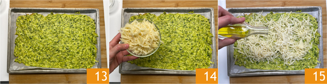 Retire a focaccia do forno 13, distribua o queijo fontina ralado por cima 14 e um fio de óleo 15.