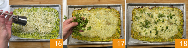 Coloque pimenta 16 e leve novamente ao forno a 180° por mais 10 minutos, depois mais 2 minutos no grill para um dourado perfeito. Retire do forno, aromatize com as ervas aromáticas 17 e sirva bem quente a focaccia de abobrinha 18.