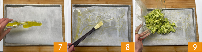 Coloque uma folha de papel manteiga em uma assadeira baixa de 30x40 cm, despeje um fio de óleo 7 e pincele para distribuir por todo o fundo 8. Despeje a massa 9.