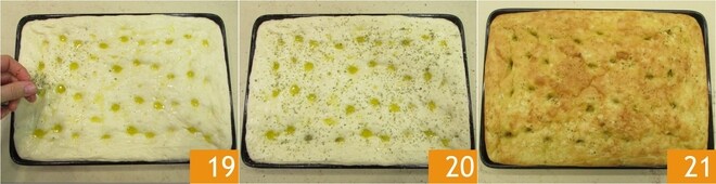 Finalmente, polvilhe com orégano 19 e asse em forno estático pré-aquecido a 220° por 30 minutos na prateleira inferior 20. Quando estiver dourada, retire do forno sua focaccia de batatas alta e fofa e sirva ainda quente 21!