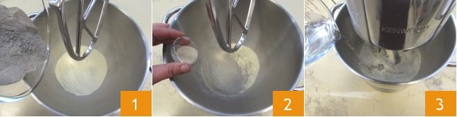 Para preparar a focaccia de trigo queimado recheada com azeitonas e tomates secos, comece pela massa da focaccia. Coloque na batedeira com gancho as duas farinhas 1 e adicione também o fermento 2 e a água 3, reservando o suficiente para dissolver o sal. Comece a amassar.