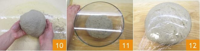 Vire o pacotinho de massa com a parte lisa para cima 10 e transfira-o para uma tigela untada com óleo, cobrindo com filme plástico 11. Deixe fermentar a 28°C por 1 hora, depois transfira para a geladeira durante a noite. Após o tempo de fermentação, a massa terá crescido bem 12. Deixe-a em temperatura ambiente por algumas horas antes de usá-la.