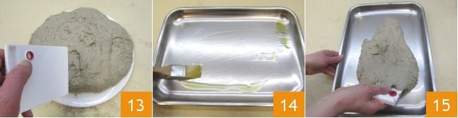 Passado o tempo, com a ajuda de uma espátula, divida a massa em duas partes, uma um pouco maior que a outra 13. Pincele com óleo a assadeira que irá abrigar sua focaccia 14, pegue a metade maior e transfira-a para a assadeira untada 15.