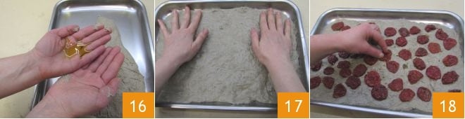 Unte também as mãos com óleo 16 e estenda a base da focaccia, esticando a massa com pressões dos dedos em direção às bordas da assadeira 17, até cobri-la. Distribua sobre a base esticada os tomatinhos secos 18.