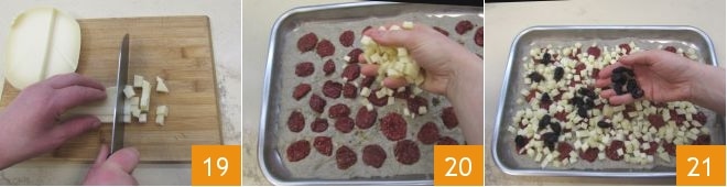 Corte o caciocavallo em cubos de aproximadamente 1 cm 19 e distribua-os também sobre a focaccia 20. Por último, adicione as azeitonas sem caroço 21.
