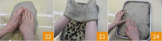 Agora pegue a metade menor da massa, que você havia reservado. Na superfície de trabalho untada com óleo, estique a massa com as mãos 22, e uma vez esticada, levante-a e coloque-a na assadeira 23, esticando-a delicadamente para cobrir o recheio 24.