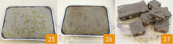 Despeje um fio de óleo (os restantes 10 g) sobre a superfície da sua focaccia 25 e asse-a por 40 minutos em forno estático pré-aquecido a 190°C. Retire do forno a focaccia de trigo queimado recheada com azeitonas e tomates secos 26 e corte-a imediatamente em quadradinhos 27!