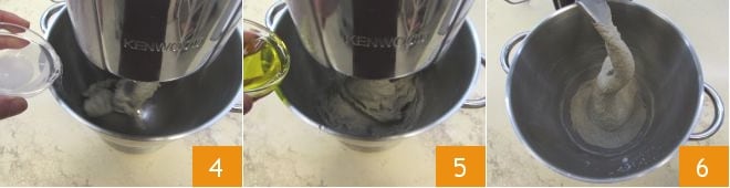 Em seguida, despeje na batedeira o sal dissolvido na água 4 e 50 g de óleo em fio 5. Continue amassando por cerca de 10 minutos 6.