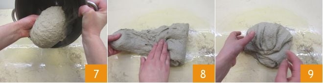 Após este tempo, a massa ainda estará muito macia e não se soltará das paredes da batedeira: com a ajuda de uma espátula, vire a massa sobre a superfície de trabalho bem untada 7 e trabalhe-a esticando-a sobre a superfície e depois dobrando-a sobre si mesma, primeiro horizontalmente 8 e depois verticalmente 9, até formar um pacotinho.