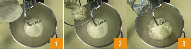 Para preparar a focaccia integral com fermento natural, despeje a farinha integral e a farinha manitoba na tigela de uma batedeira equipada com gancho 1, adicione o fermento natural já refrescado nas 24 horas anteriores 2 e a água 3 e comece a bater para obter uma massa lisa.