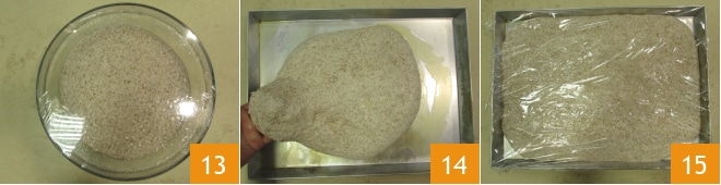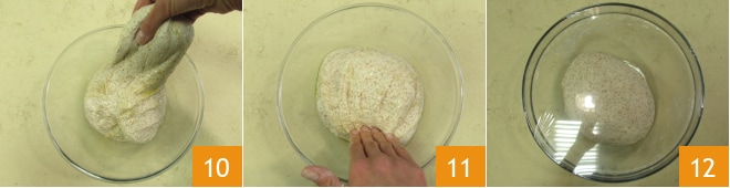 Gire a tigela, pegue outra extremidade da massa 10 e leve-a para o centro 11, depois gire novamente a tigela e repita a operação mais 2 vezes, totalizando 4 dobras. Cubra a tigela com um pano e deixe a massa descansar por 15 minutos, depois repita as 4 dobras. Cubra novamente a tigela e deixe descansar por mais 15 minutos, antes de realizar mais 4 dobras pela terceira e última vez. Neste ponto, cubra a tigela com filme plástico 12 e deixe crescer em temperatura ambiente, longe de correntes de ar, por 6 horas. Após esse tempo, coloque a tigela na geladeira e deixe a massa amadurecer por 18 horas.