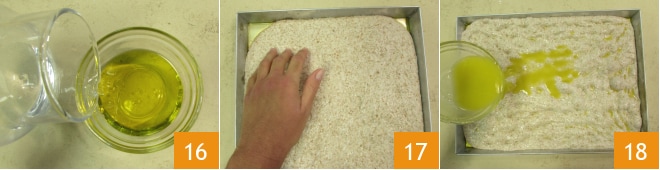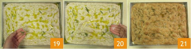Enquanto isso, prepare a emulsão despejando o óleo e a água em uma tigela pequena 16 e misturando com um garfo. Uma vez crescida, faça buracos na focaccia pressionando as pontas dos dedos na massa; se estiver difícil, você pode untar suas mãos com óleo 17. Despeje a emulsão distribuindo-a por toda a superfície 18.