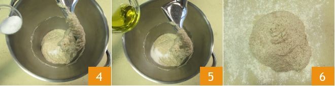 Agora adicione o sal 4 e o óleo 5 e trabalhe tudo por cerca de 10 minutos até que estejam completamente absorvidos. Quando a massa estiver lisa e bem homogênea, coloque-a em uma superfície enfarinhada 6.