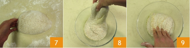 Modele a massa entre suas mãos para obter uma forma esférica regular 7, depois transfira-a para uma tigela. Neste ponto, comece a fazer a primeira dobra, levantando uma extremidade da massa 8 e levando-a para o centro 9.