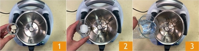 Para preparar a focaccia de tomatinhos e azeitonas com Bimby, coloque no copo o fermento biológico 1, o açúcar 2 e 100 g de água 3. Dissolva o fermento por 2 minutos a 37°, configurando a velocidade 2.