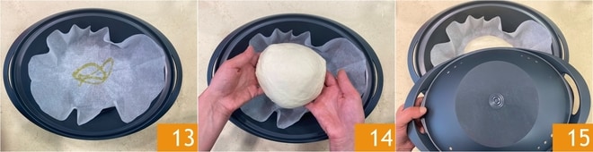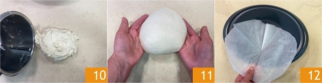 Transfira a massa para a bancada enfarinhada 10 e forme uma bola lisa e homogênea 11. Enquanto isso, forre o recipiente do Varoma com uma folha de papel manteiga 12.