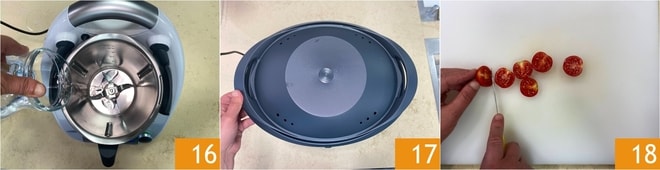 Coloque no copo 250 g de água 16 e o suco de limão, feche com a tampa e posicione o Varoma por cima 17. Configure o programa de fermentação por 2 horas a 37°. Agora lave os tomatinhos e corte-os ao meio, reservando-os 18.
