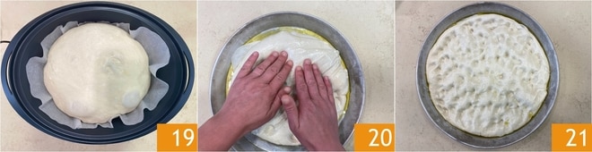 Uma vez completada a fermentação, retire com cuidado o Varoma 19. Despeje a massa em uma forma untada com diâmetro de 32 cm e estenda-a com as mãos 20. Com a ponta dos dedos, pressione a massa para criar buracos 21.